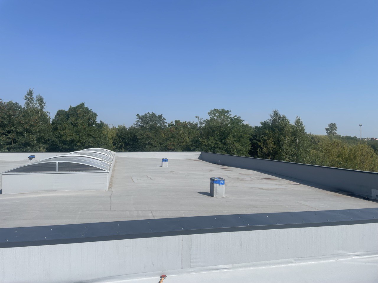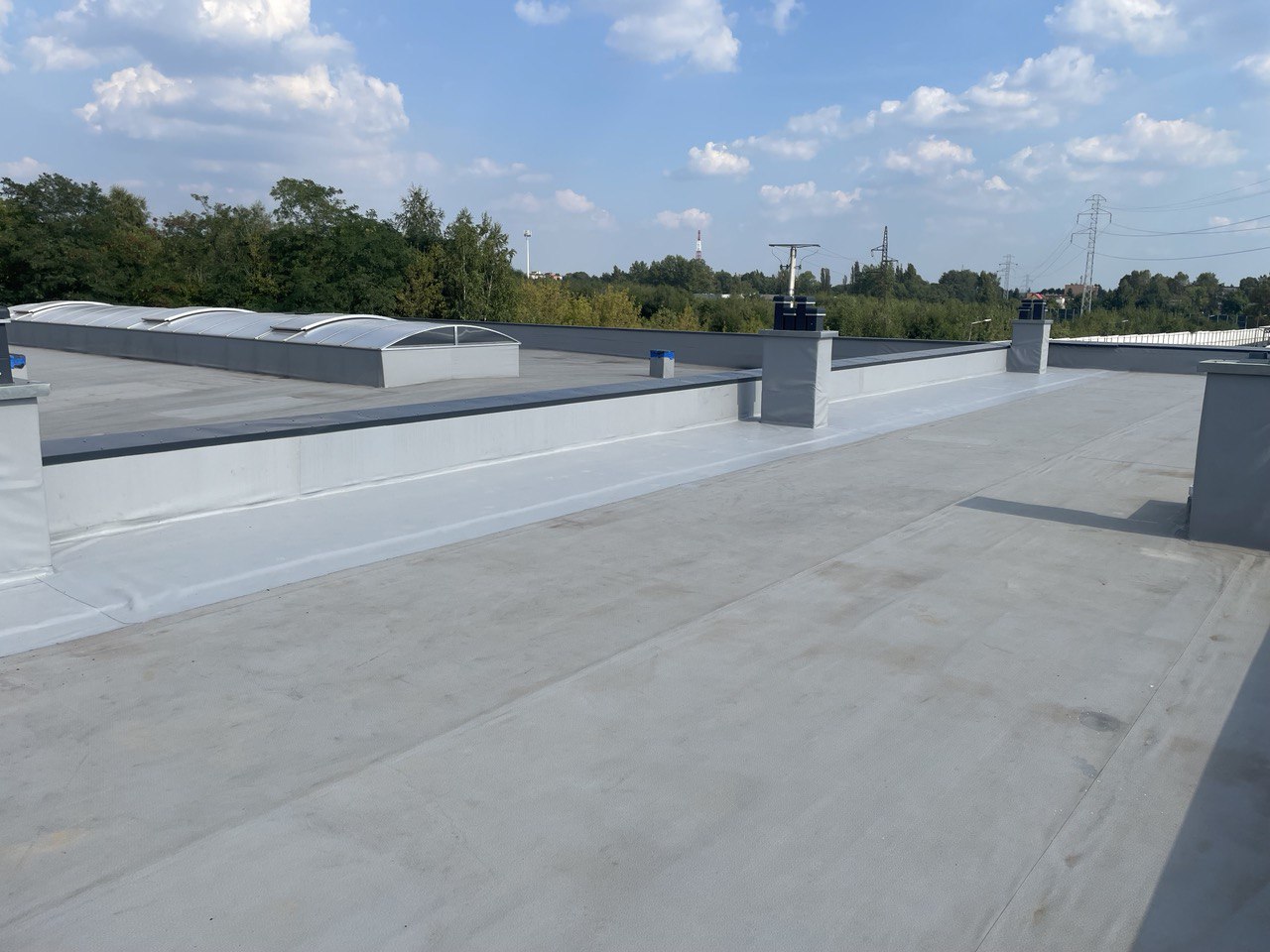 Zakres zrealizowanych prac: kompleksowa hydroizolacja dachu hali o powierzchni 800 m2 (docieplenie wełną i wykończenie membraną PVC) oraz dachu budynku biurowego o powierzchni 220 m2 (docieplenie styropianem i wykończenie membraną PVC). Realizacja 2024 r.
